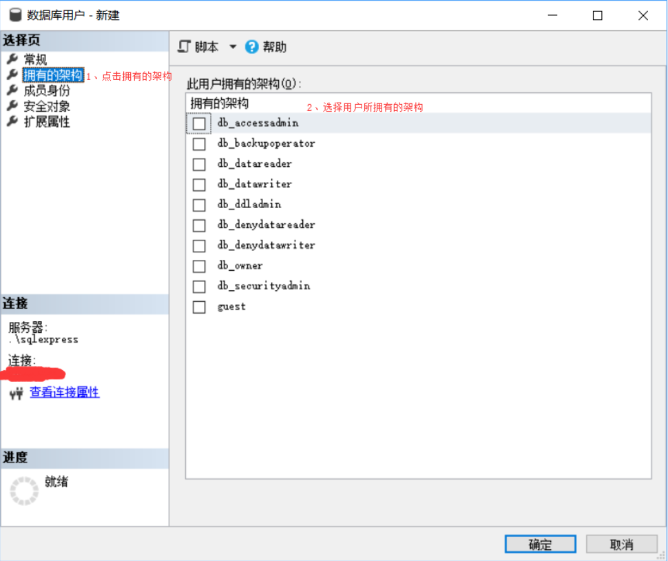 3、在数据库用户-新建弹出框-》选择用户所拥有的架构。