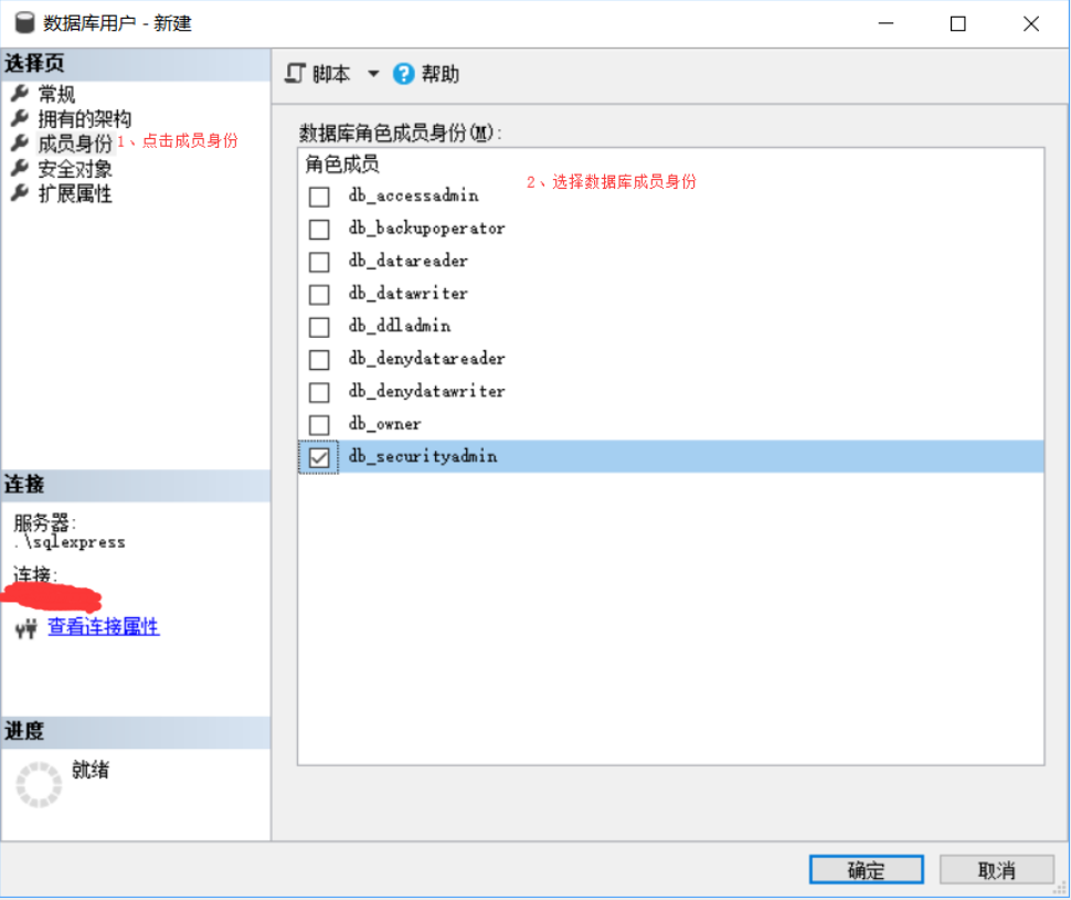 4、在数据库用户-新建弹出框-》点击成员身份-》选择数据库成员身份。