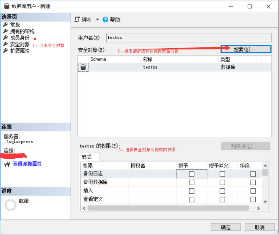 5、在数据库用户-新建弹出框-》点击搜索选择一个安全对象-》选择安全对象以后选择安全对象所拥有的权限。