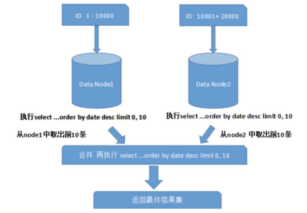 跨节点多库进行查询时,会出现limit分页、order by排序等问题。分页需要按照指定字段进行排序,当排序字段就是分片字段时,通过分片规则就比较容易定位到指定的分片;当排序字段非分片字段时,就变得比较复杂了。需要先在不同的分片节点中将数据进行排序并返回,然后将不同分片返回的结果集进行汇总和再次排序,最终返回给用户。如图所示: