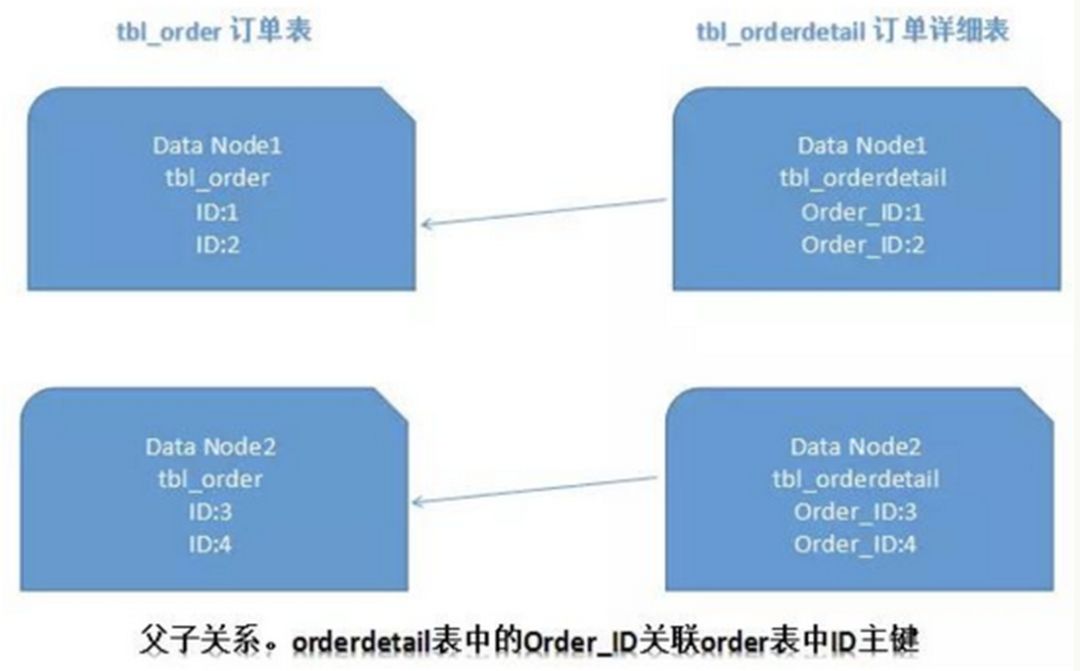 关系型数据库中,如果可以先确定表之间的关联关系,并将那些存在关联关系的表记录存放在同一个分片上,那么就能较好的避免跨分片join问题。在1:1或1:n的情况下,通常按照主表的ID主键切分。如下图所示:
