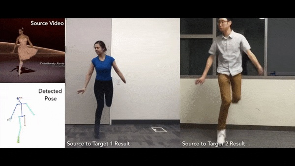 2018年8月,伯克利发表了基于GAN的Every Body Dance,让一个不会跳舞的视频主角,瞬间学会另一段视频里精致的舞步:
