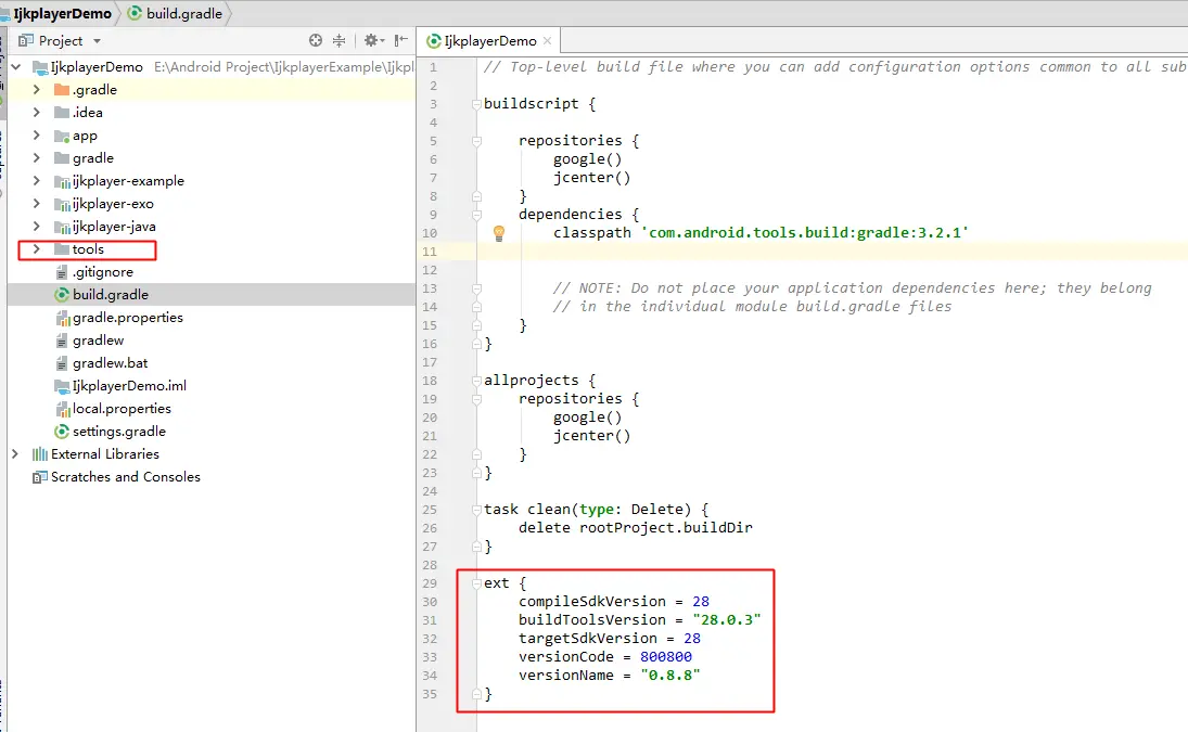将 ijkplayer-android-build\ijkplayer-android\android\ijkplayer 目录下的 bulid.gradle 文件中的 ext 节点拷贝到我们的 Project 的根目录下的 bulid.gradle 文件中,并修改 compileSdkVersion、buildToolsVersion 和 targetSdkVersion与我们的 Project的主 Module 的保持一致。versionCode 和 versionName 都是从 ijkplayer 项目中拷贝过来的就不用改了。