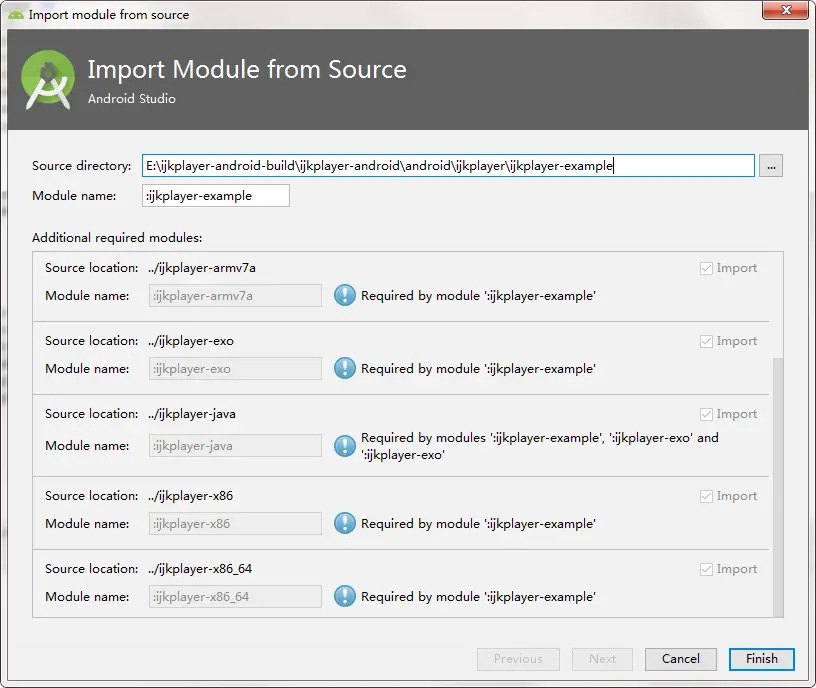 ① 依次执行 File->New->Import Module->选择路径 /android/ijkplayer/ijkplayer-example。