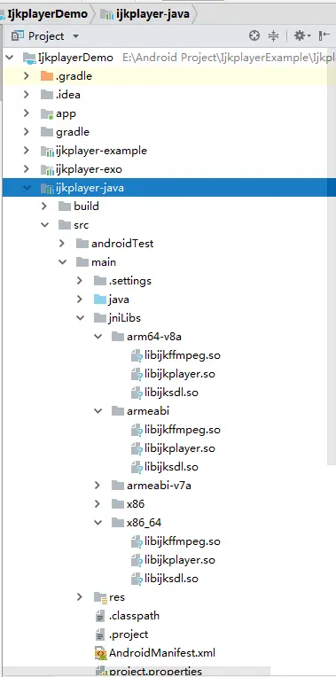 在 ijkplayer-java\src\main\ 目录下新建一个名为 jniLibs 的文件夹,将 ijkplayer-arm64、 ijkplayer-armv5、ijkplayer-armv7a、ijkplayer-x86、ijkplayer-x86_64 目录中的 \src\main\libs 目录下的文件夹拷贝到 jniLibs 文件夹中。移动完成以后如下图所示。
