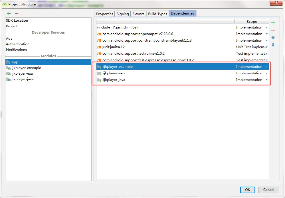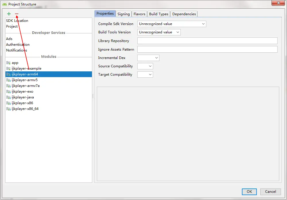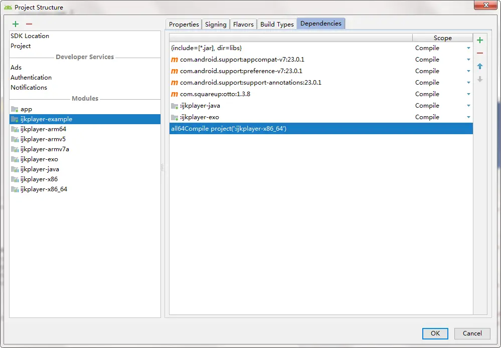 ② 取消 ijkplayer-example 这个 Module 对 ijkplayer-arm64、 ijkplayer-armv5、ijkplayer-armv7a、ijkplayer-x86、ijkplayer-x86_64 的引用