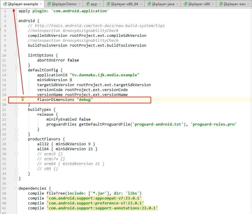 解决办法:在 ijkplayer-example Module 的 build.gradle文件的 defaultConfig 节点中 添加 flavorDimensions “debug"即可,flavorDimensions 貌似可以随意起名。