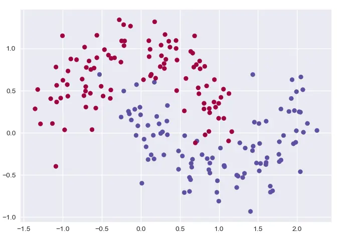x, y = dataTool.make_moons(200, noise=0.2)