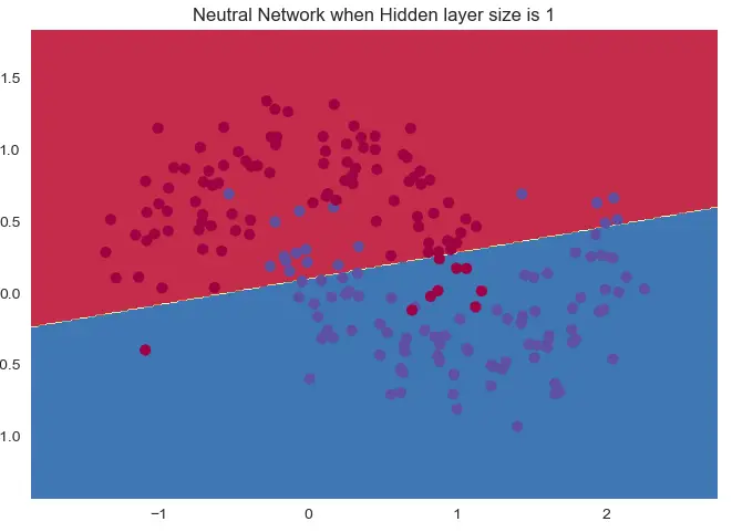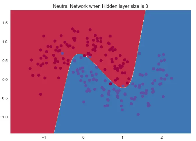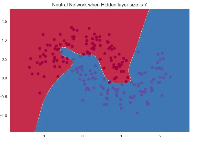 Tool.plot_decision_boundary(mlp.predict, x, y, 'Neutral Network when Hidden layer size is ' + str(i))