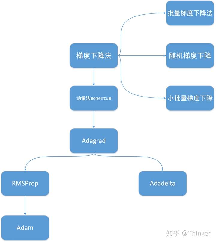 首先看一下下面的流程图,机器学习中常用的一个有梯度优化算法之间的关系: