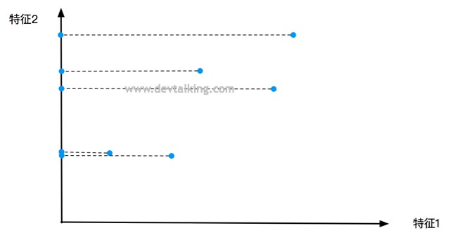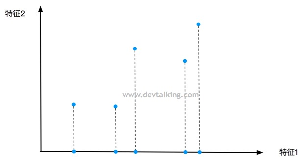 如上图中显示,将特征2抛弃,这里大家先注意一下这五个点落在特征1轴上的间距。