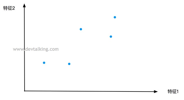或者如上图所示抛弃特征1,大家再注意一下这五个点落在特征2轴上的间距。能很明显的发现,抛弃特征2,落在特征1轴上的五个点之间间距比较大,并且分布均匀。而抛弃特征1,落在特征2轴上的五个点之间间距大多都比较小,并且分布不均匀。
