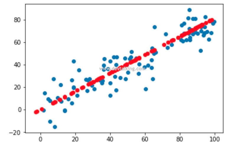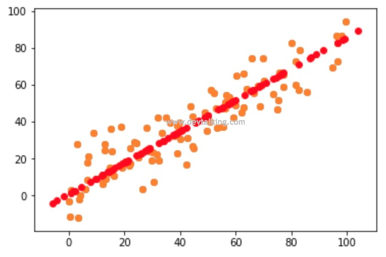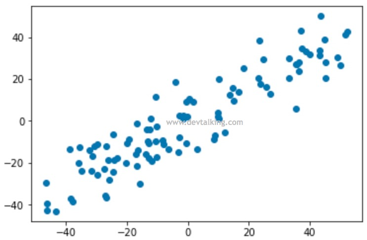 这张图是之前小节中生成的,其中蓝色的点是我们构建的原始样本数据,红色的点是经过PCA降维后,又通过PCA还原维度的样本数据。对这个图我们可以这样理解,原始样本数据的分布都在这条红色点组成的直线上下,而导致这些蓝色点没有落在红色直线上的原因就是因为数据有噪音,所以通过PCA降维其实是去除了数据的噪音。但这些噪音也是也是数据信息,所以通常我们说使用PCA对数据进行降维后会丢失一些数据信息。