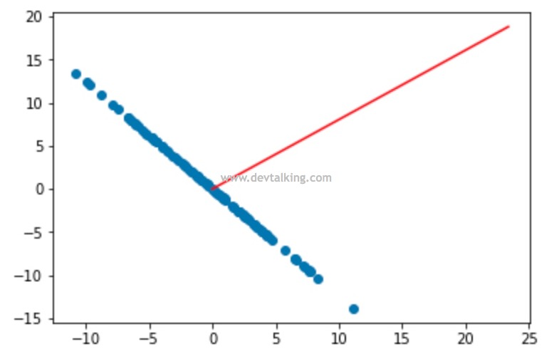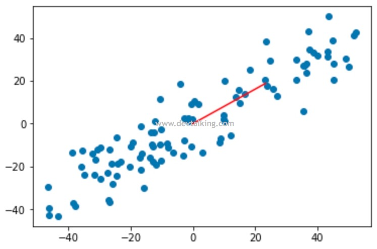 但是简单粗暴的完全丢弃一个特征自然是不合理的,这极大的影响了训练出模型的正确性。所以,按照方差最大的理论,我们应该再找到一个特征向量,使样本数据落在这个特征向量后的方差最大,那么这个特征向量代表的特征就是我们需要的降维后的特征。这就是支撑PCA算法的理论之一。
