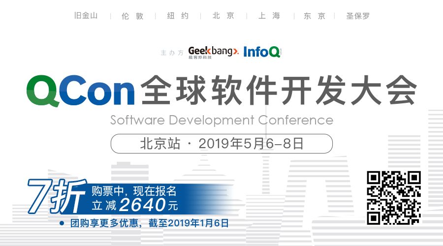 活动推荐2019 年 5 月 6-8 日北京国际会议中心,QCon 与您相约获得启发,共同关注行业趋势与工程实践。点击 「阅读原文」 或识别二维码了解 QCon 十周年精心策划,早鸟 7 折立减 2640 元,有任何问题欢迎联系票务小姐姐 Ring:电话 010-53935761,微信 qcon-0410