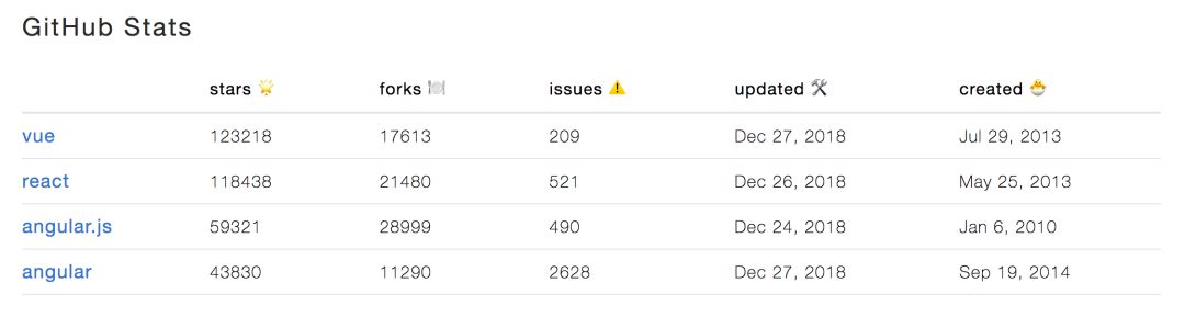 Vue2018 年是 Vue 大火的一年,今年 6 月底,Vue 在 GitHub 上的 star 数反超 React,同一周,Vue 和 React 的 star 数双双破了 10W,这在前端圈算是一件里程碑的事件了。