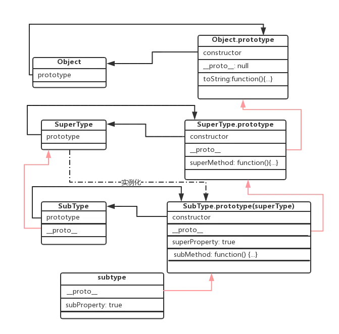 如上图所示,实现原型链继承的关键在于使 SubType.prototype 的原型 __proto__ 指向 SuperType.prototype,如果对比上面两张图的化,我们会发现图一中 SuperType 的实例 superType 和 图二中 SubType.prototype 很类似,所以我们完全可以让 SubType.prototype 指向 SuperType 的一个实例,上代码。