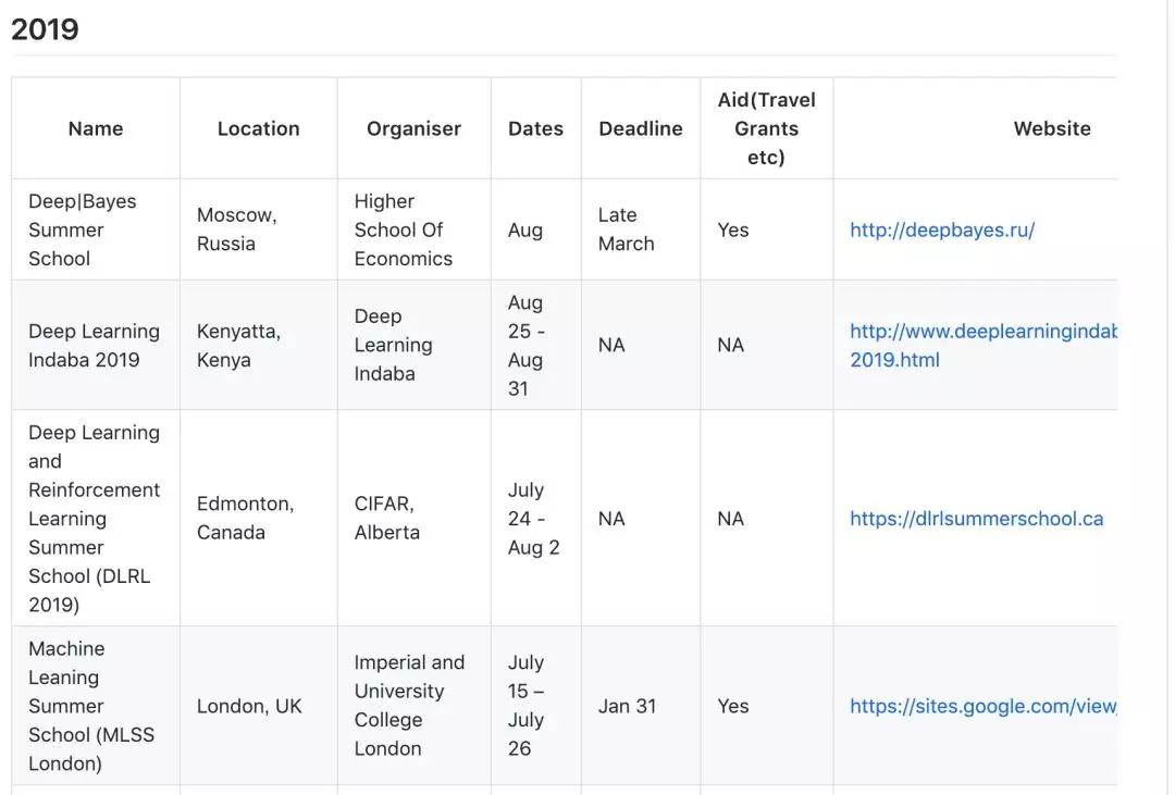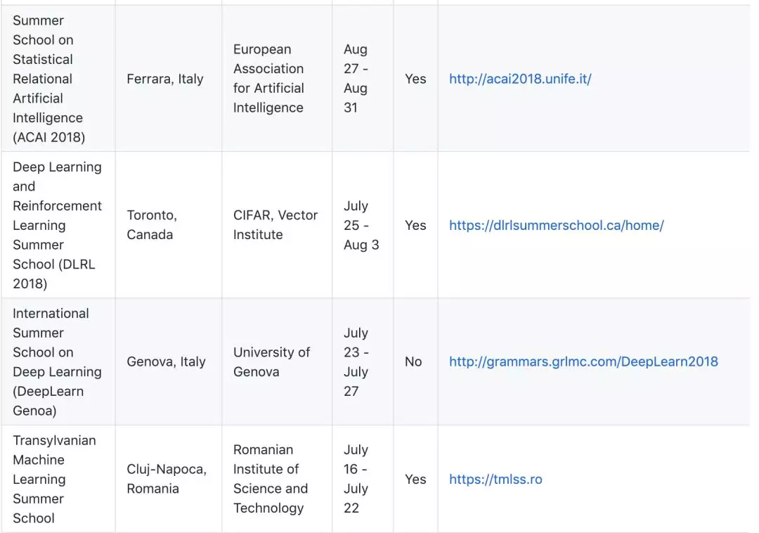 在此列表中,作者列出了这些暑期学习的开办地点、组织方、日期、截止日期、是否有资助等信息。其中包括我们所熟知的由 CIFAR 等机构主办的 DLRL 暑期学校。
