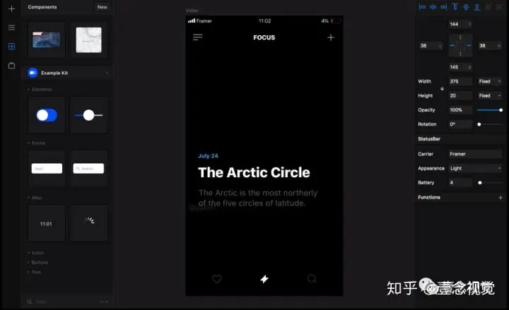 Framer X——最新上线的版本,功能强大且入门门槛低了很多。现在你仅需点击几下就可以制作和之前一样的高阶交互效果。无需任何编程知识仍可达到编程制作的效果。可自定义页面过渡、轻松创建滚动组件以及可滑动的 UI元素,而且元素还可以快速响应。但是如果你需要在原型上添加一些额外的高大上效果,那你就要到一家商店,里面都是用 React编写的代码组件:YouTube播放器,UI工具包,货币转换器,可交互式地图组件。如果懂 React,你也可以自己建立组件以供自己或他人使用。更棒的是,还可以直接交付代码给开发套用,减少沟通中的摩擦和误解。