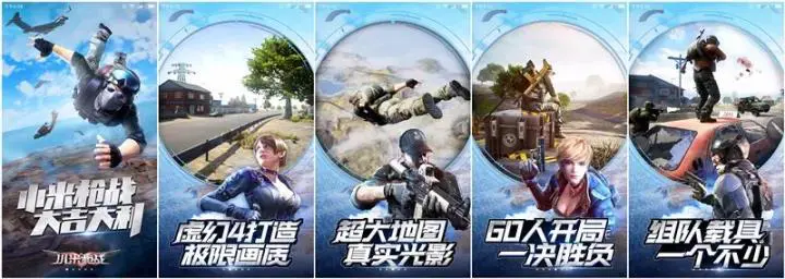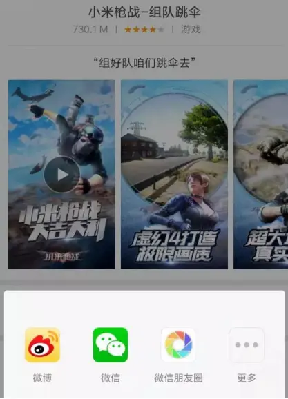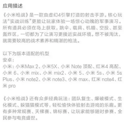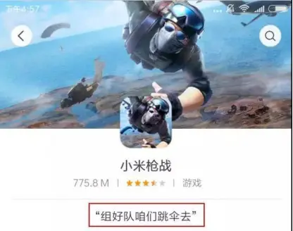 “小米枪战”简洁的一句话简介,已经让用户快速地了解到APP的功能,它共有三层意思: 1,组队——多人参战,共同娱乐,带社交属性(社交属性); 2,跳伞——现时“大逃生”类游戏必备环节(游戏属性); 3,邀约用户的口吻引导下载。