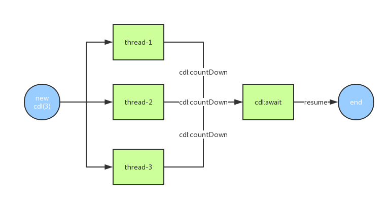 CountDownLatch简称CDL,它的作用挂起当前线程,在多个线程状态达到一致的时候再继续运行当前线程,在实际应用中相当广泛,一个简单的流程图如下: