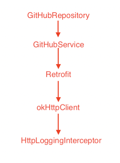从上面的代码可以看到 Application 依赖 GitHubRepository。GitHubRepository 依赖 GitHubService。