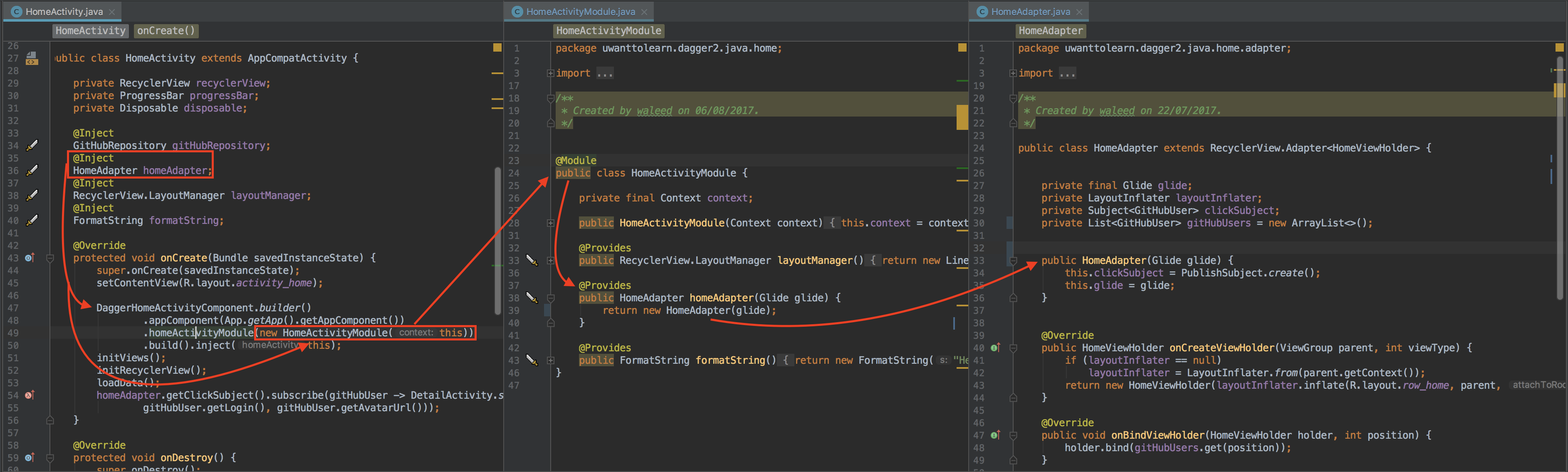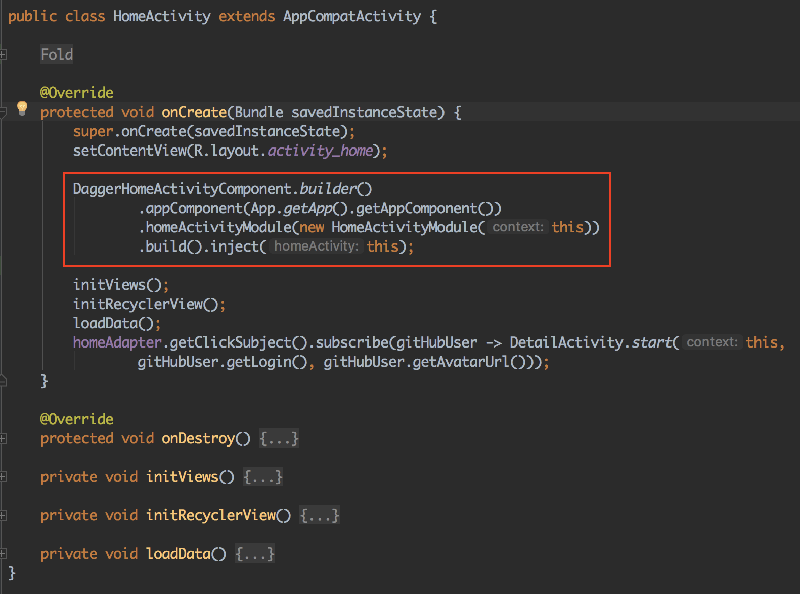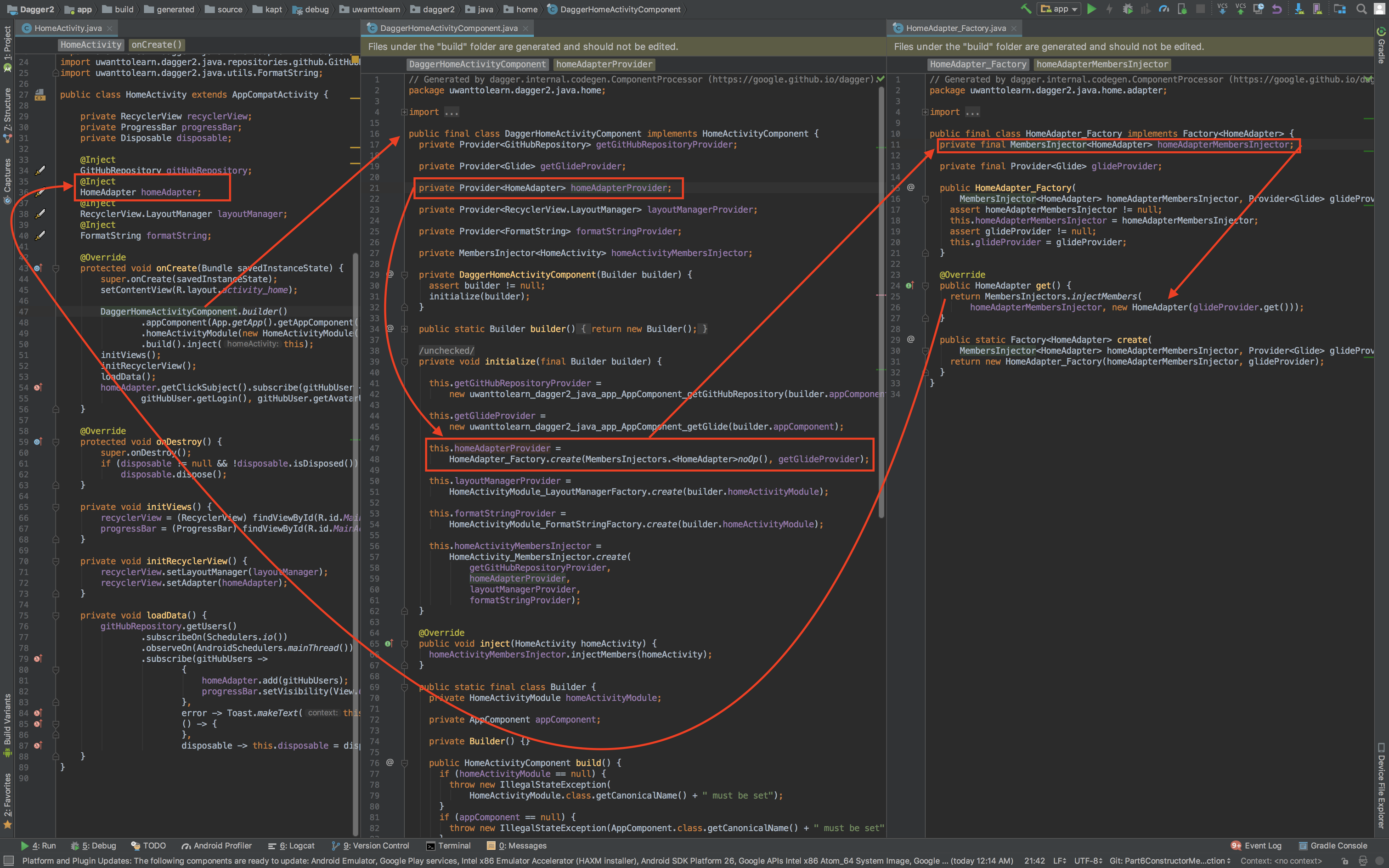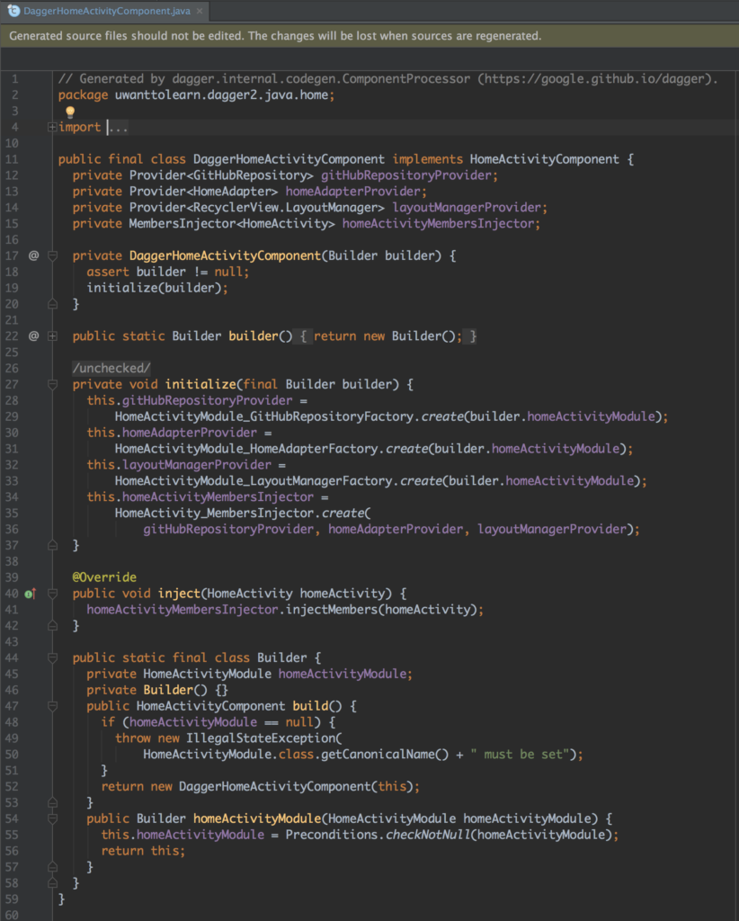 上图展示了 Dagger2 如何将 HomeAdapter 作为一个字段注入到 HomeActivity。Dagger2 生成的模版代码如下。