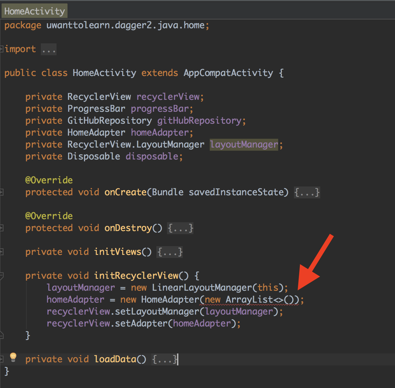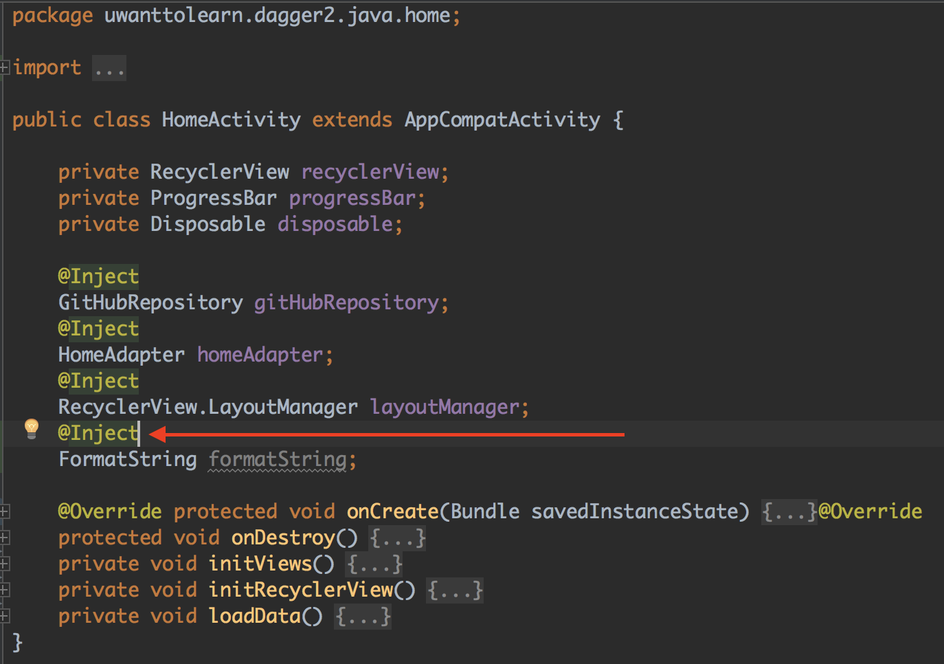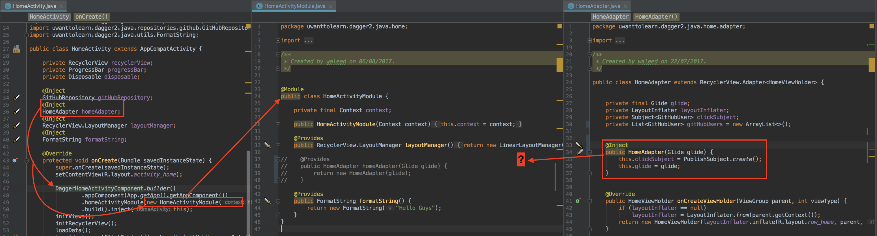 上图展示了 Dagger2 如何将 HomeAdapter 作为一个字段注入到 HomeActivity。Dagger2 生成的模版代码如下。