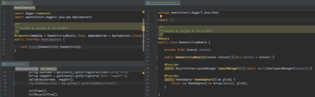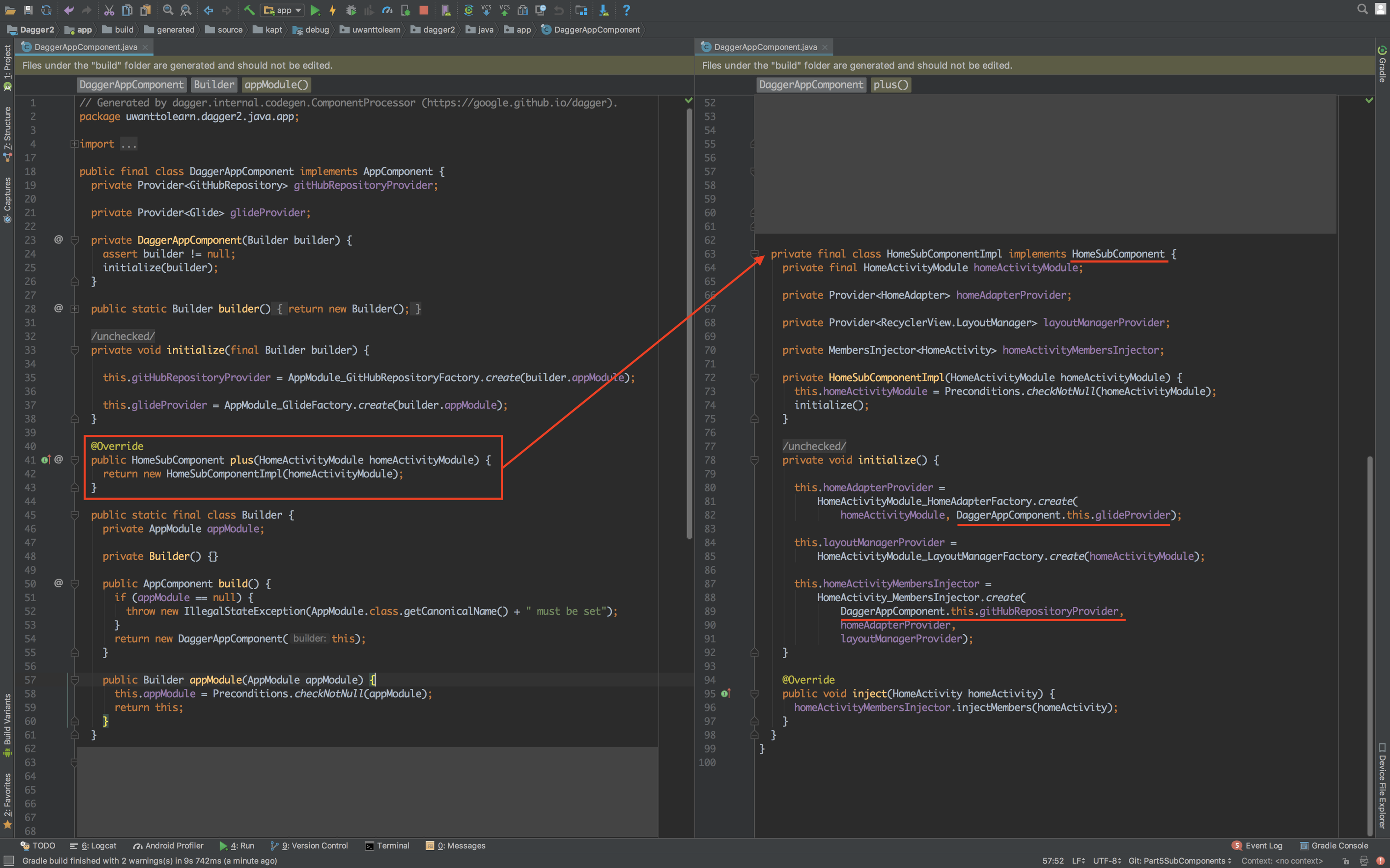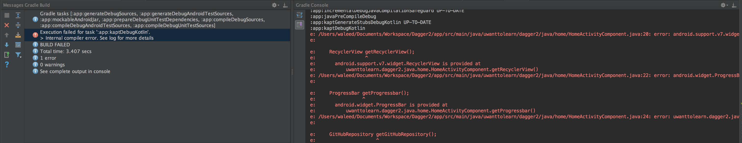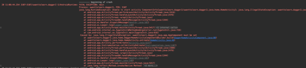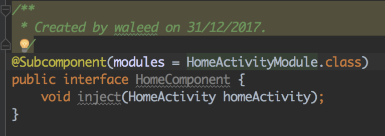 Dagger2 总是为 Component 创建一个单独类。例如 DaggerAppComponent, DaggerHomeActivityComponent,但是并不会为 SubComponents 创建。此时运行程序将会报错,因为,类 HomeActivity 中的 GitHubRepository 将会报错空指针,以前是从 Parent Component 注入的,现在将 @Component 修改为 @SubComponent 之后,将不再适用。