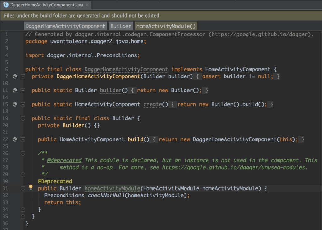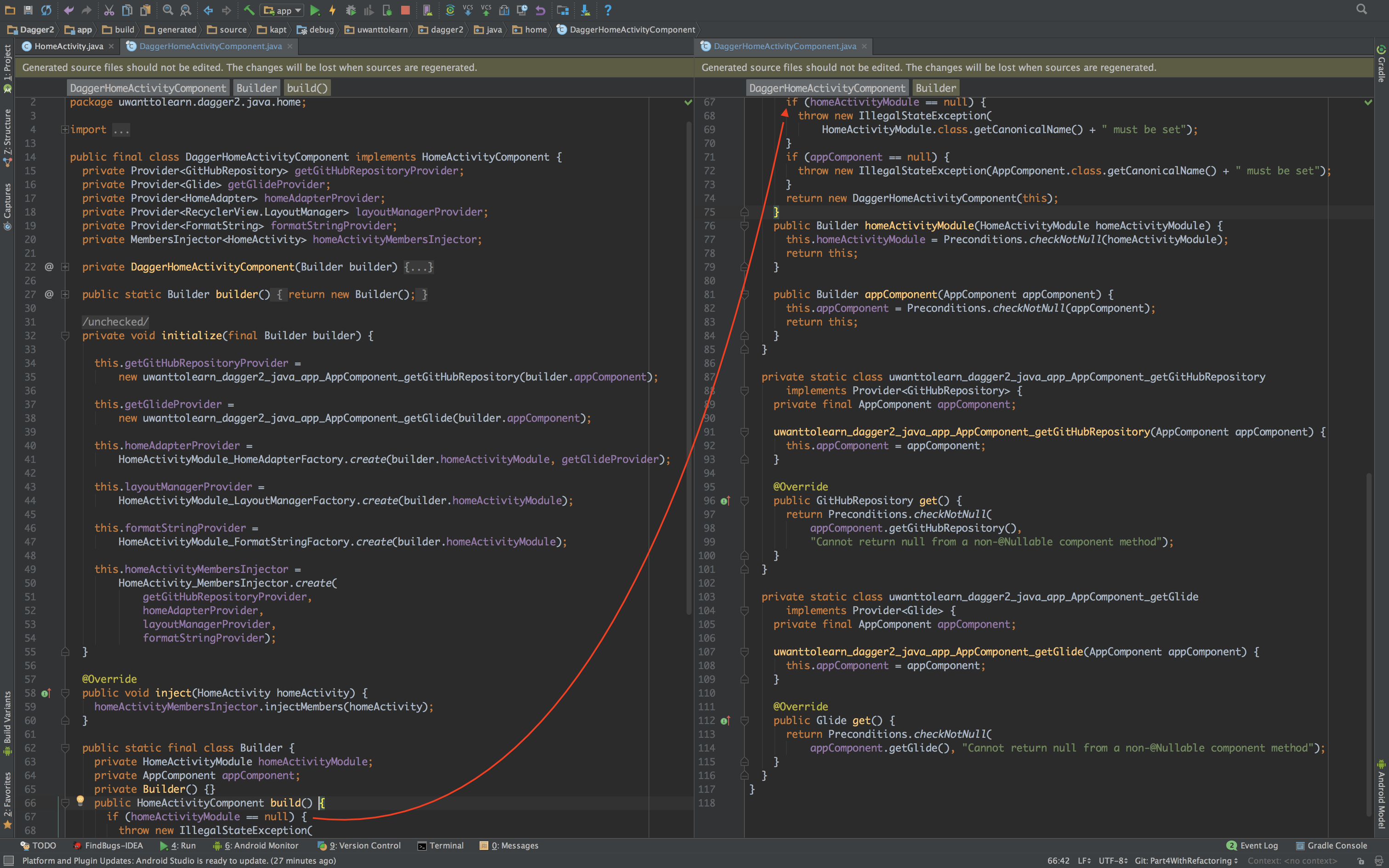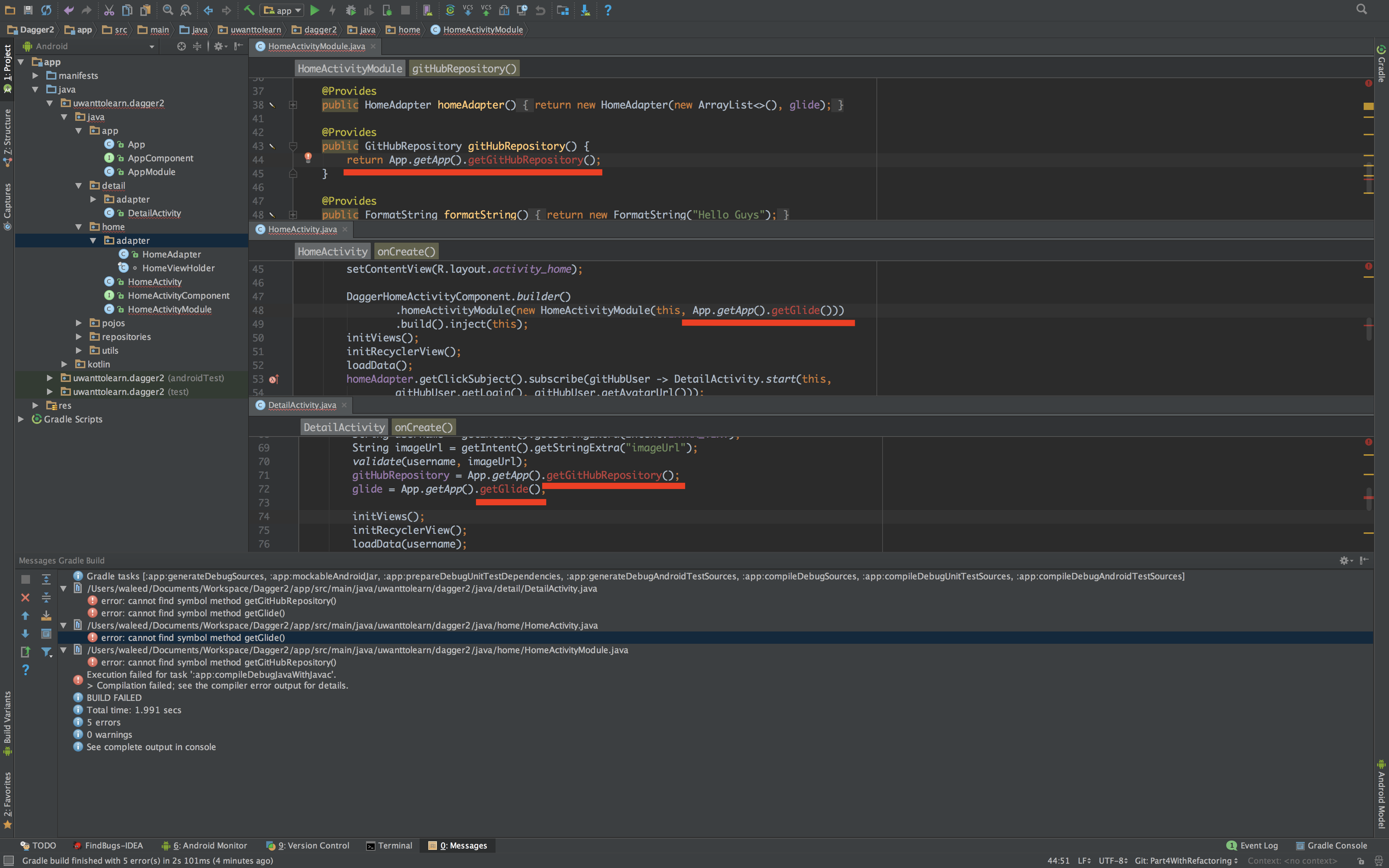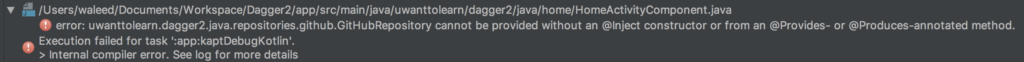 Dagger2 总是为 Component 创建一个单独类。例如 DaggerAppComponent, DaggerHomeActivityComponent,但是并不会为 SubComponents 创建。此时运行程序将会报错,因为,类 HomeActivity 中的 GitHubRepository 将会报错空指针,以前是从 Parent Component 注入的,现在将 @Component 修改为 @SubComponent 之后,将不再适用。