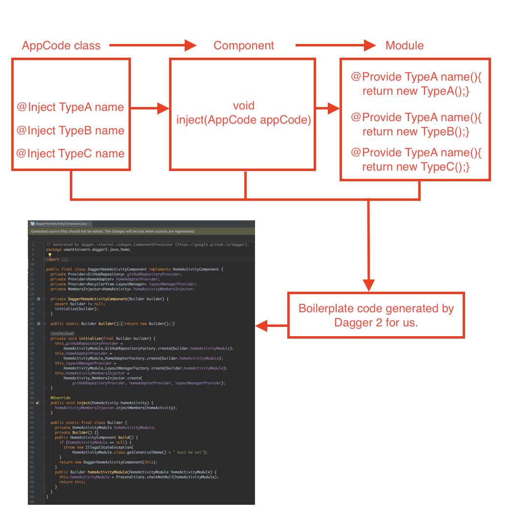 使用 Components 时,我们使用 dependencies 属性,稍后作为组合对象提供依赖的属性。这就是为什么不能在 AppComponent 中使用 inject 方法注入所需要的依赖。AppComponent 作为一个组合对象在 HomeAcirtivytComponent 内。所以 HomeActivityComponent 不清楚 AppComponent 可以委托的依赖请求。正如 Glide 和 GitHubRepository 需要在 AppComponent 中声明两个方来来提供,因为如果不提供,HomeActivityComponent 将无法访问这些依赖。