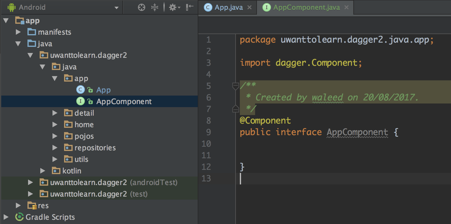 接着创建 AppComponent 对象。它是一个空类,然后是 AppModule,它将提供 GitHubRepository 和 Glide 的依赖。