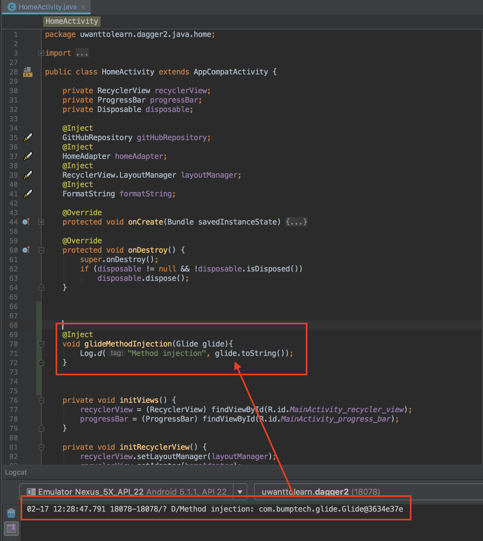 由日志看出 Dagger2 确实注入了 Glide 对象。并且不用通过显示的调用方法。