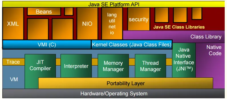 Apache Harmony大体上分为三个层:操作系统、Java虚拟机、Java类库。它的特点在于虚拟机和类库内部被高度模块化,每一个模块都有一定的接口定义。操作系统层与虚拟机层之间的接口由Portability Layer定义,它封装了不同操作系统的差异,为虚拟机和类库的本地代码提供了一套统一的API访问底层系统调用。虚拟机与类库之间的接口除了Java规范定义的JNI、JVMITI外,还加入了一层虚拟机接口,由内核类和本地代码组成。实现了虚拟机接口的虚拟机都可以使用Harmony的类库实现,并且可以被Harmony提供的同一个Java启动程序启动