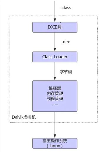 一个应用首先经过DX工具将class文件转换成Dalvik虚拟机可以执行的dex文件,然后由类加载器加载原生类和Java类,接着由解释器根据指令集对Dalvik字节码进行解释、执行。最后,根据dvm_arch参数选择编译的目标机体系结构。