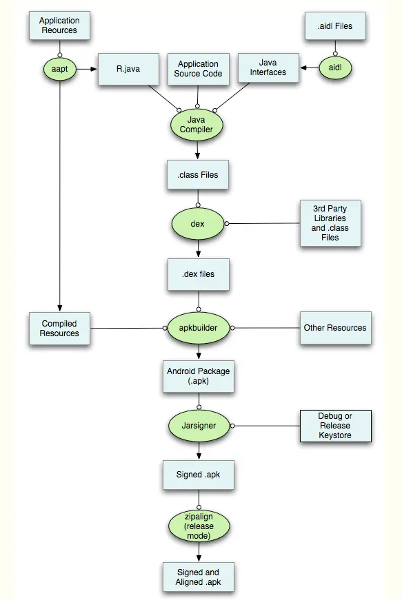 - 使用aapt工具把dex文件、资源文件以及AndroidManifest.xml文件(二进制格式)组合成APK