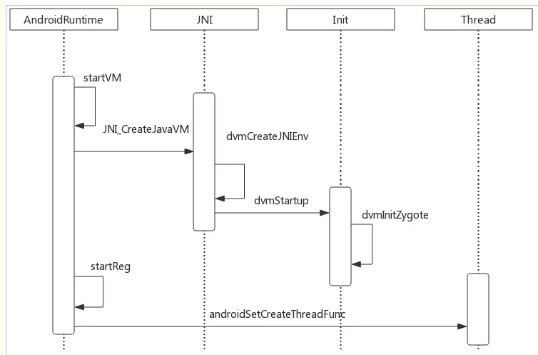 在JNI中,dvmCreateJNIEnv为当前线程创建和初始化一个JNI环境,即一个JNIEnvExt对象。最后调用dvmStartup来初始化前面创建的Dalvik虚拟机实例。函数dvmInitZygote调用了系统的setpgid来设置当前进程,即Zygote进程的进程组ID。这一步完成后,Dalvik虚拟机的创建和初始化工作就完成了。