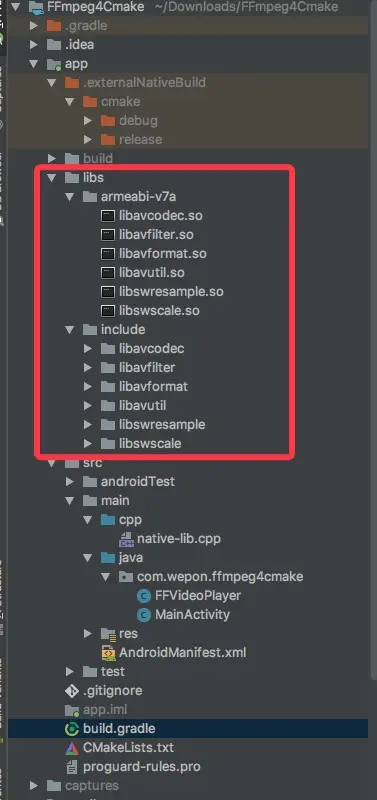 然后把我们的so文件和include文件放到lib目录下,还有build.gradle文件和CMakeLists.txt文件的代码一并放出,如下: