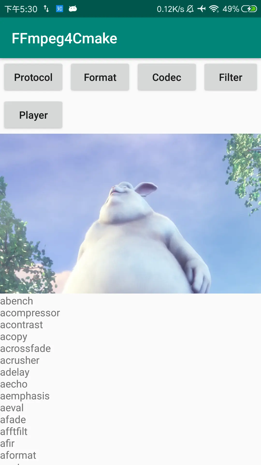 到这里我们就能写视频文件的播放了,这里我使用了一个网上找的视频文件地址进行播放,记得加上联网的权限。播放效果如下,生成gif太大了就没生成了(只是简单的处理了视频的解压,音频这块暂时没有处理,FFmpeg要学习的东西很多,可以参考其他文档):