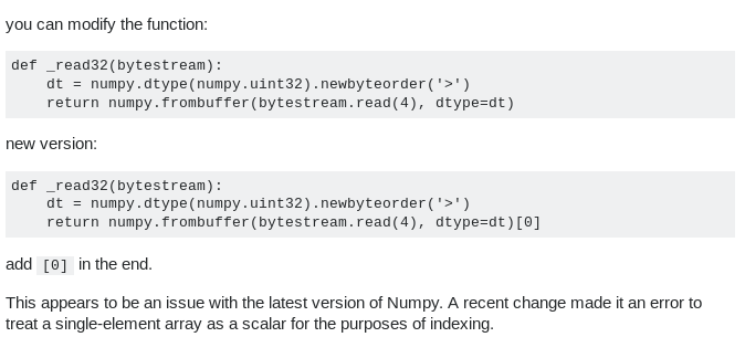 如图,大意为导致该错误的原因是由于最新版的Numpy做了一些改动。根据图中方法,将下载到的input_data.py文件进行修改:在_read32函数定义最后增加[0]