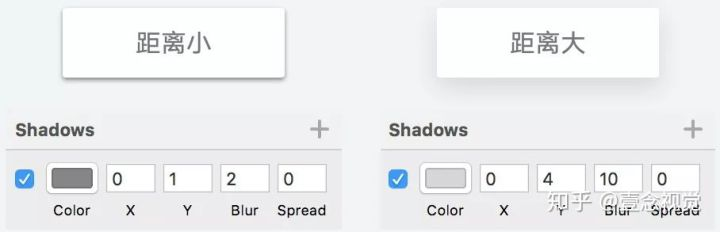 当元素的距离水平面越近,阴影距离元素也就越近,即 XY 轴越小,模糊也越小,如果离得远则相反。