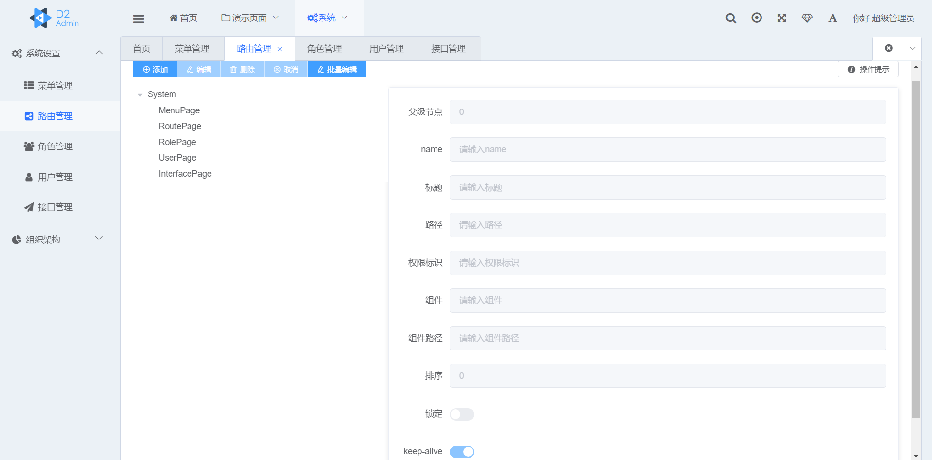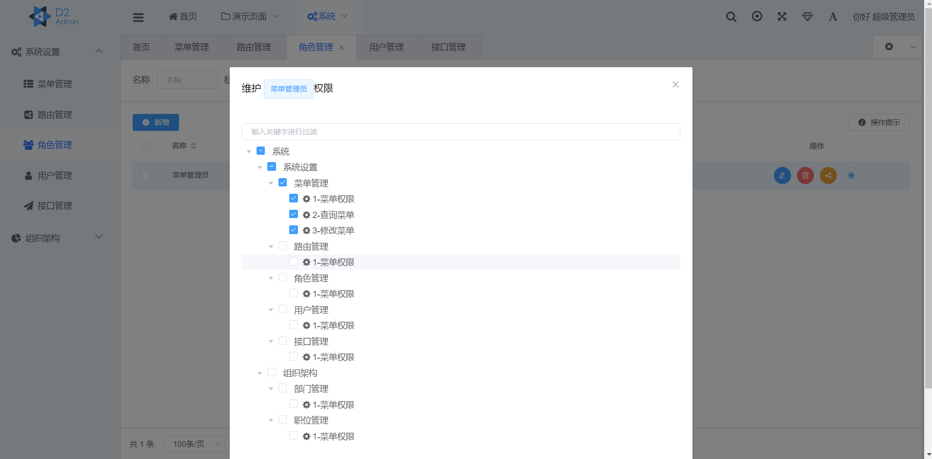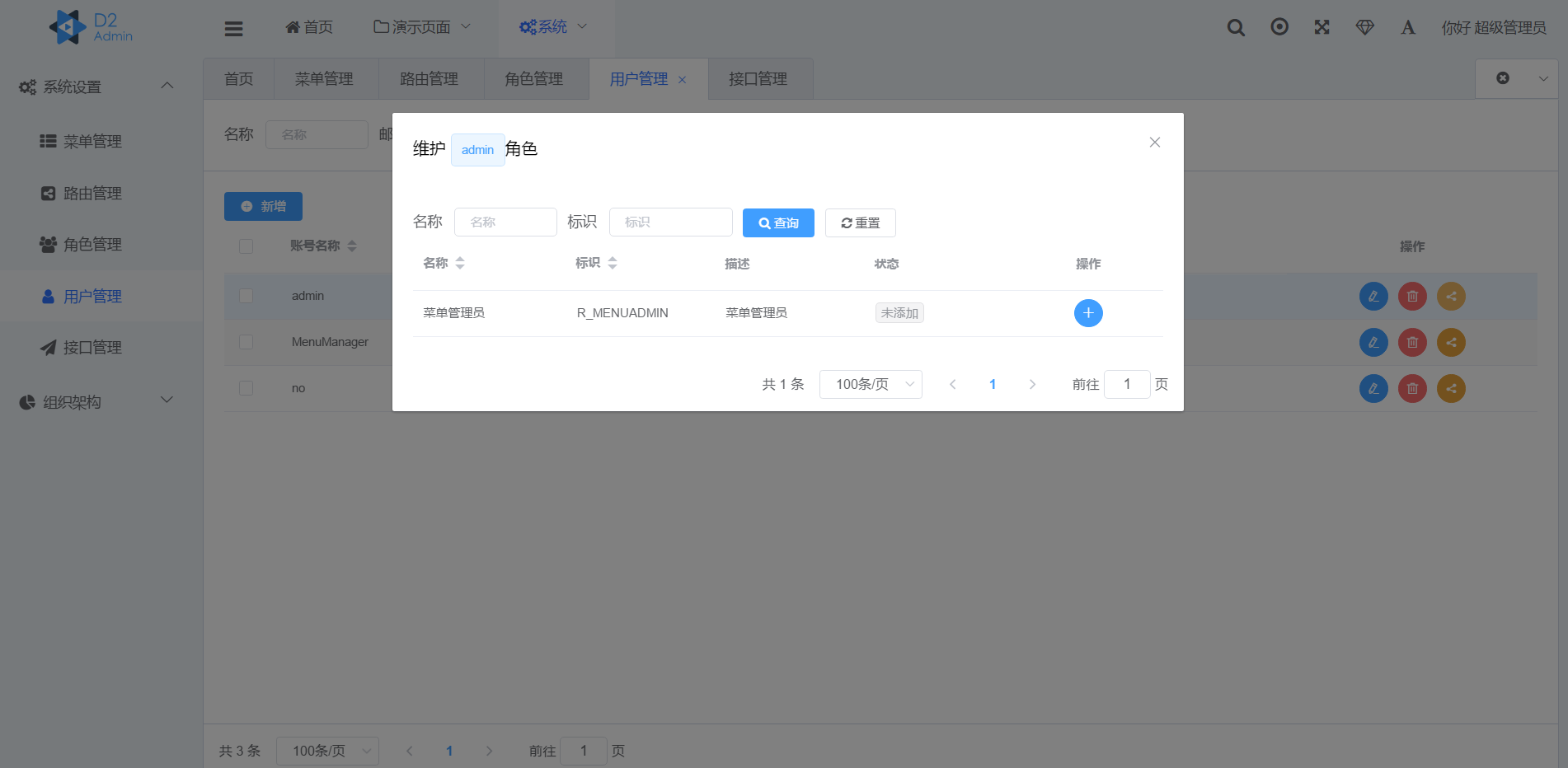 需要权限控制的菜单与路由通过界面的管理功能进行添加,确保菜单的