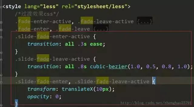 下图所示是一个简单的过渡效果的例子,需要将想实现过渡效果的元素放在transition标签中包裹,通过name=“slide-fade”来声明过渡效果名称,并在对应的vue文件中添加过渡效果 的css样式,这样就可以简单的完成该元素的过渡效果。