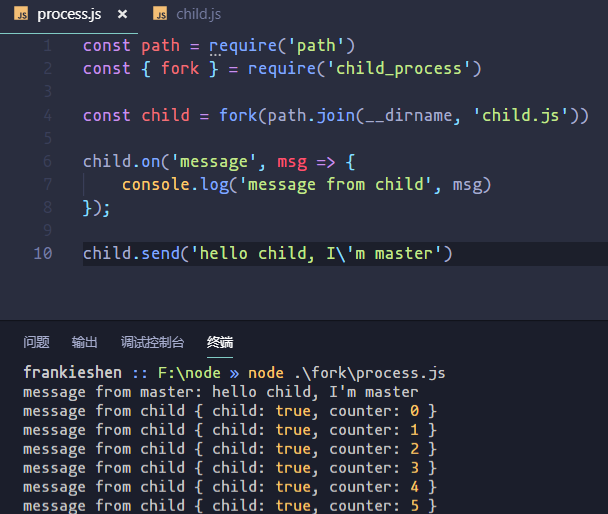 child.send('hello child, I\'m master')
