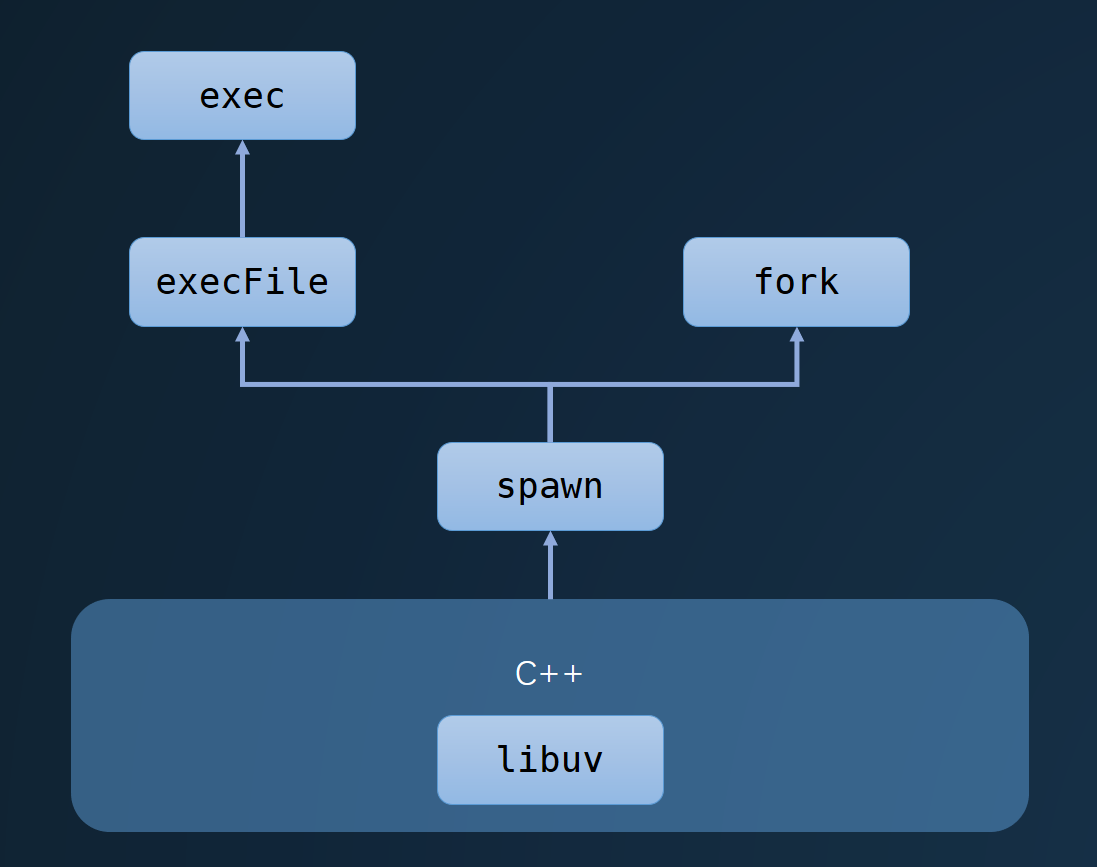 其实可以看到,这些方法都是对spawn方法的复用,然后spawn方法底层调用了libuv进行进程的管理,具体可以看下图。