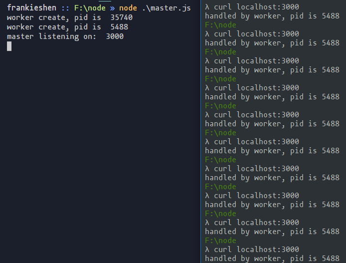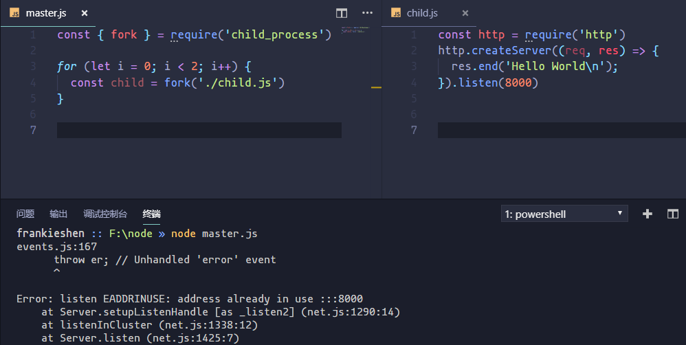 我们fork了两个子进程,因为两个子进程同时对一个端口进行监听,Node会直接抛出一个异常(Error: listen EADDRINUSE),如上图所示。那么我们能不能使用代理模式,同时监听多个端口,让master进程监听80端口收到请求时,再将请求分发给不同服务,而且master进程还能做适当的负载均衡。