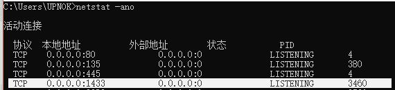 使用 netstat -ano 查看端口使用情况 存在1433即成功开启
