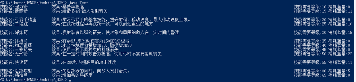 System.out.println("技能名:" + name + "\t效果:" + code + "\t技能需要等级:" + lv +"\t消耗蓝量:" + cost );