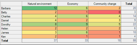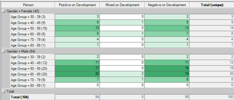 新的交叉表查询可以通过一个或两个属性(例如年龄和性别)或案例来分析主题,并且总计会自动计算。例如,检查面试受访者多久会提到一个特定主题或问题: