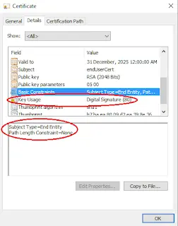“SHA256withRSA”是我用它来签名证书的签名算法。 在 keyUsage 中,“keyCertSign”仅限制证书使用以签署其他证书。虽然 SSL 客户端需要“digitalSignature”使用,但我们的 Web 浏览器使用该证书进行实体身份验证和数据源身份验证的完整性。